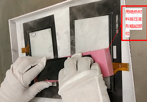 6、开始分离作业时,拿住产品的四个角,轻轻扭动,使液晶与盖板玻璃脱离。如果产品厚而